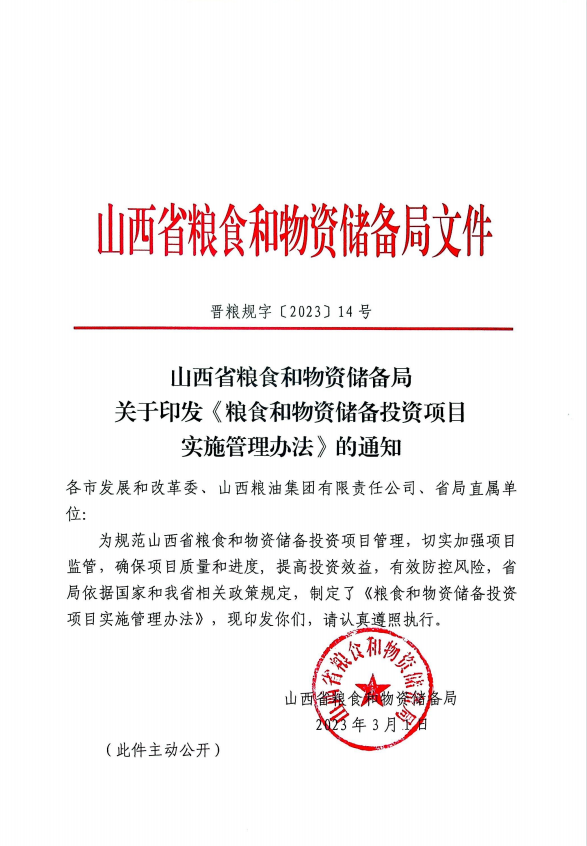 山西省粮食和物资储备局关于印发《粮食和物资储备投资项目实施管理办法》的通知(晋粮规字[2023]14号).pdf